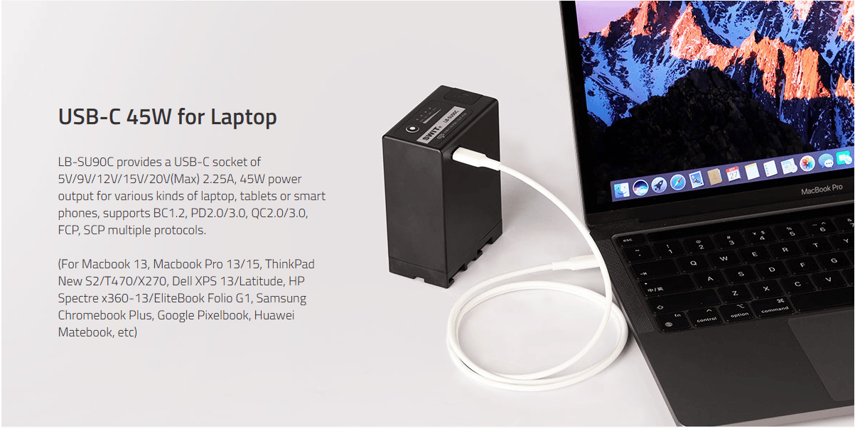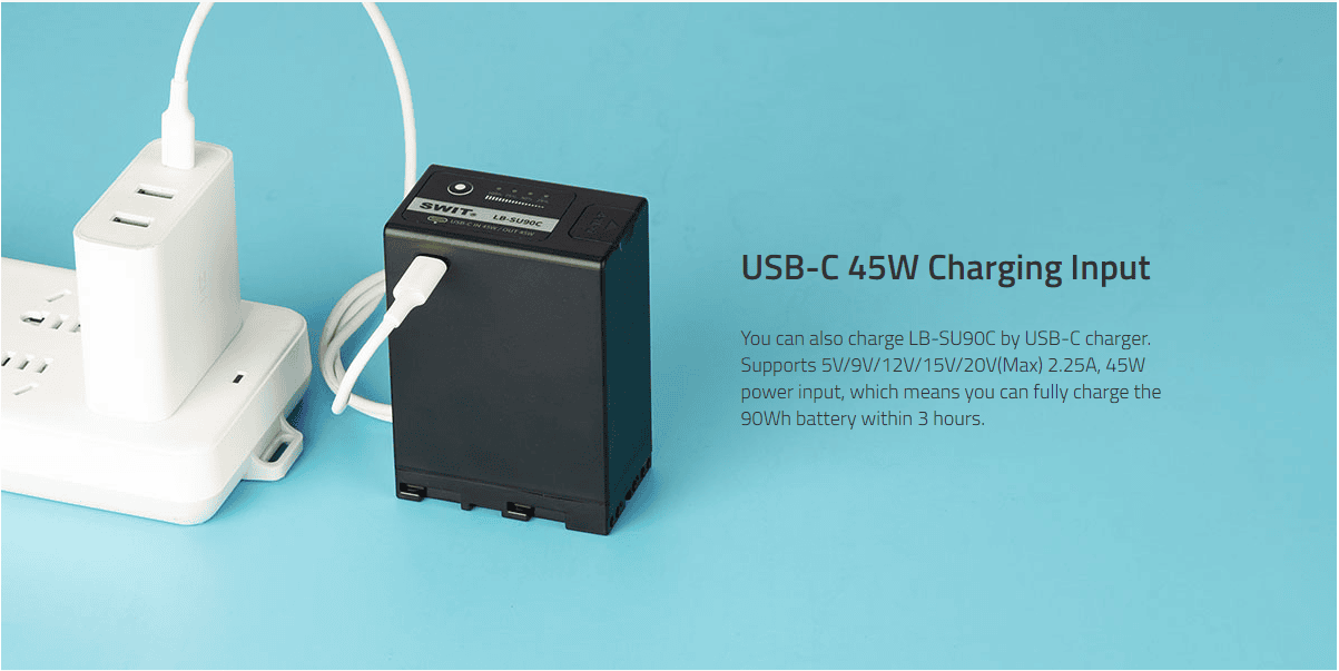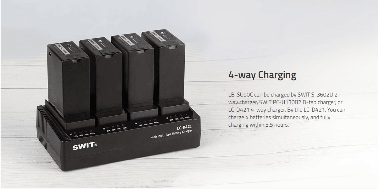 LB-SU90C LB-SU98 LB-SU75 | 1)SONY FX6 2)SONY PXW-Z280/Z190 3)SONY PXW-FS7 4)SONY PXW-FS5 5)SONY PXW-X280 6)Can't use on PXW-X160/X180 7)Can't use on PMW-300/EX1/1R,EX160/280,EX3/F3, FS7 MARK II | SONY BP-U90/60/30 SONY BP-U35/70 | LC-D421(+ KA-C10U) PC-U130B/B2 S-3602U UC-2065 65W USB-C/A GaN Travel Charger | Can't use on sony original chargers and 3rd-party chargers | 14.4V |
