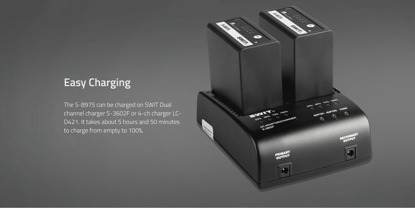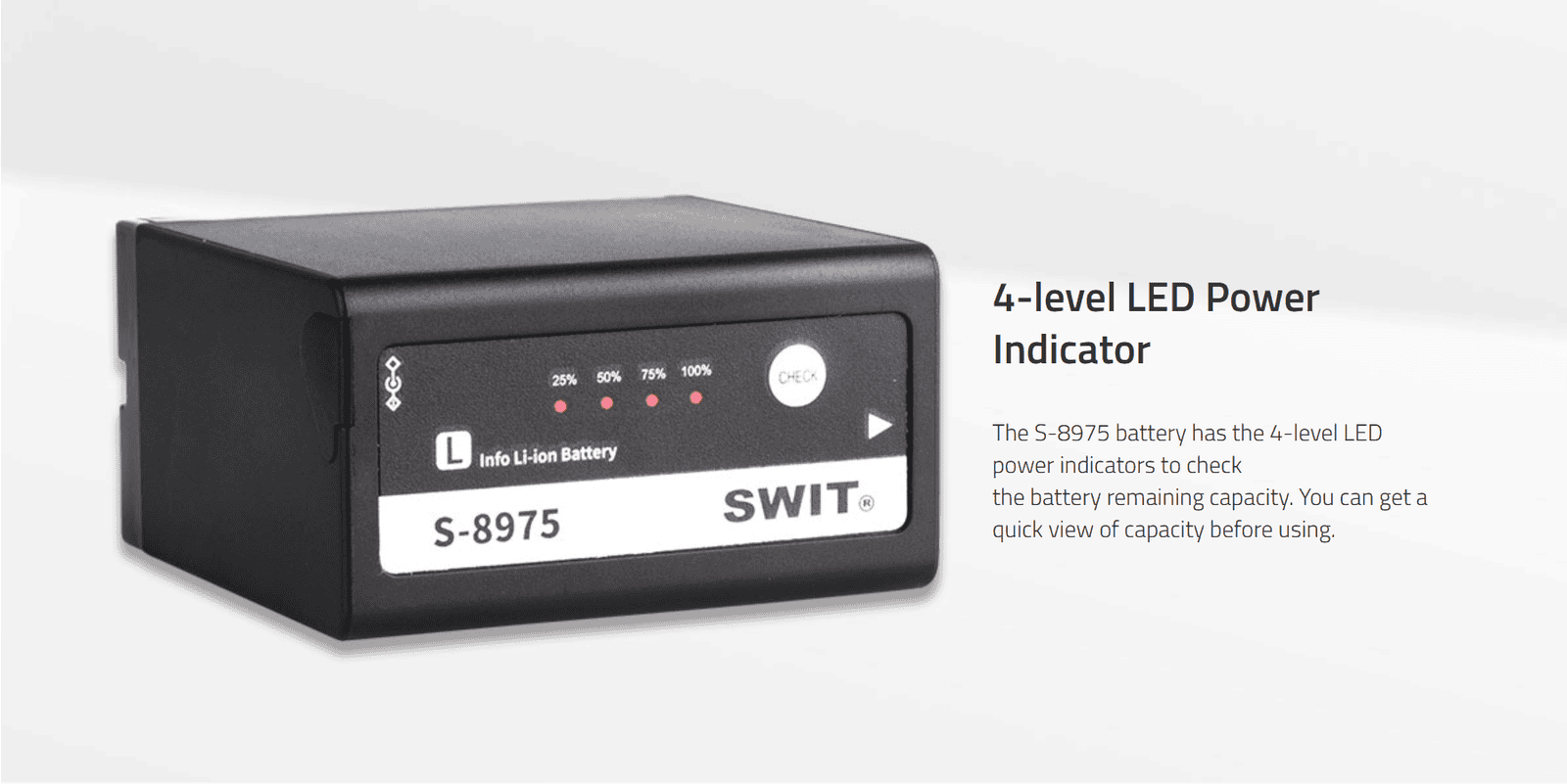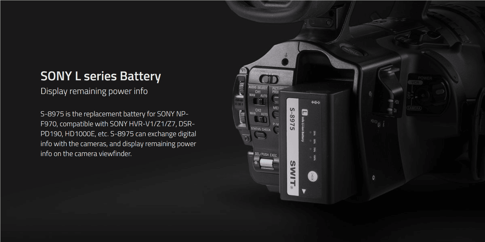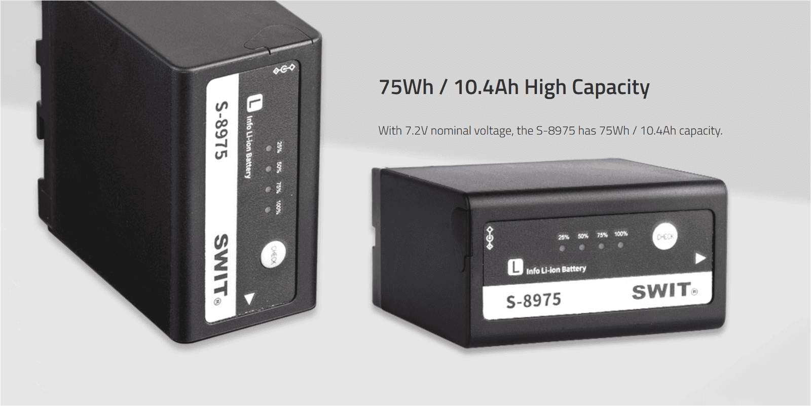 75Wh/10.4Ah NP-F-type (Sony L-series) DV battery ◆SWIT Exclusive Quality ◆Pole-tap DC input/output ◆Power info on camera ◆4LED indicator ◆Multiple circuit protection ◆Comparable to Sony L series NP-F