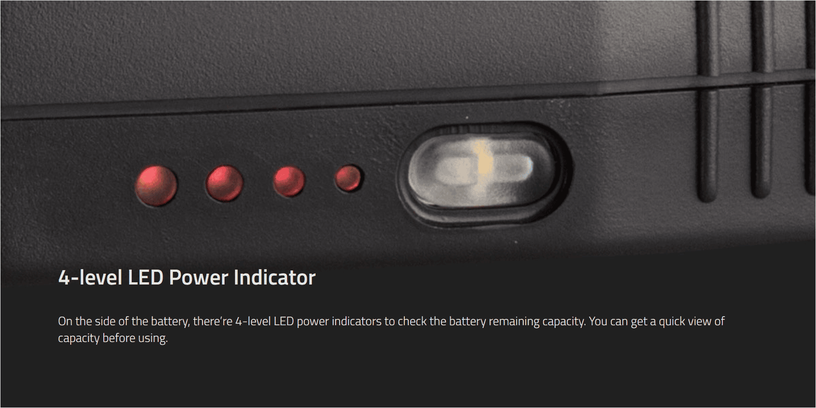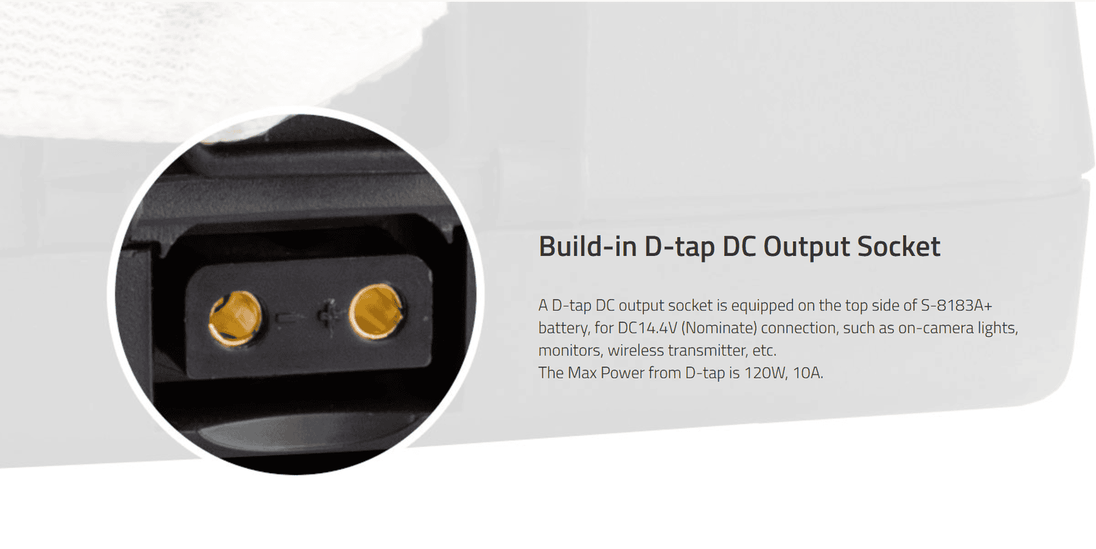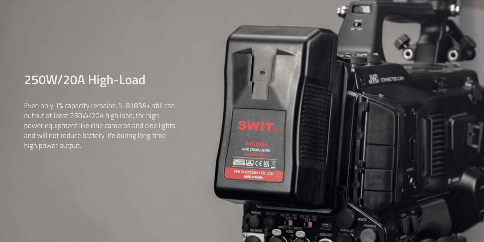 High Load; SWIT Exclusive Quality; Also especially ideal for long term use on high power draw lights with max stable output 250W/20A; 270Wh; 6A fast charging (by SWIT PC-P460S/S-3812S); 1xD-tap in/output; 4-LED indicators; Multiple peak-current protections; 14.4V Gold-mount