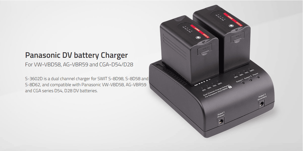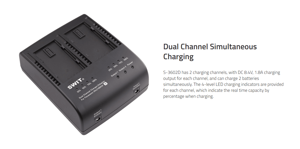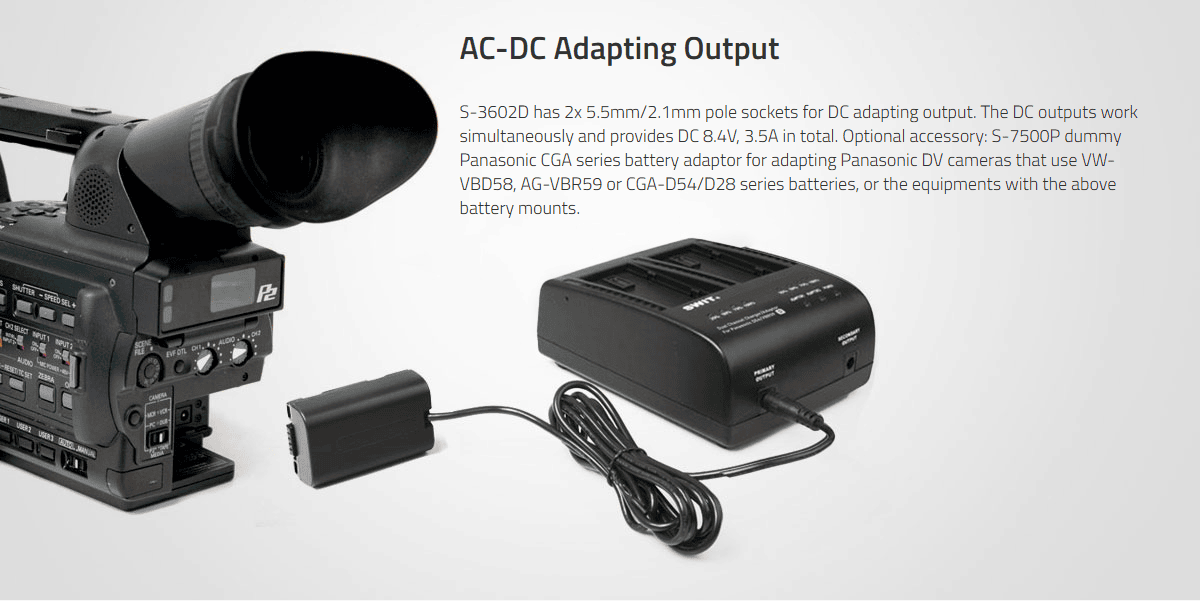 S-3602D | 2x2A DV charger compatible to Panasonic VBD/VBR/CGA series