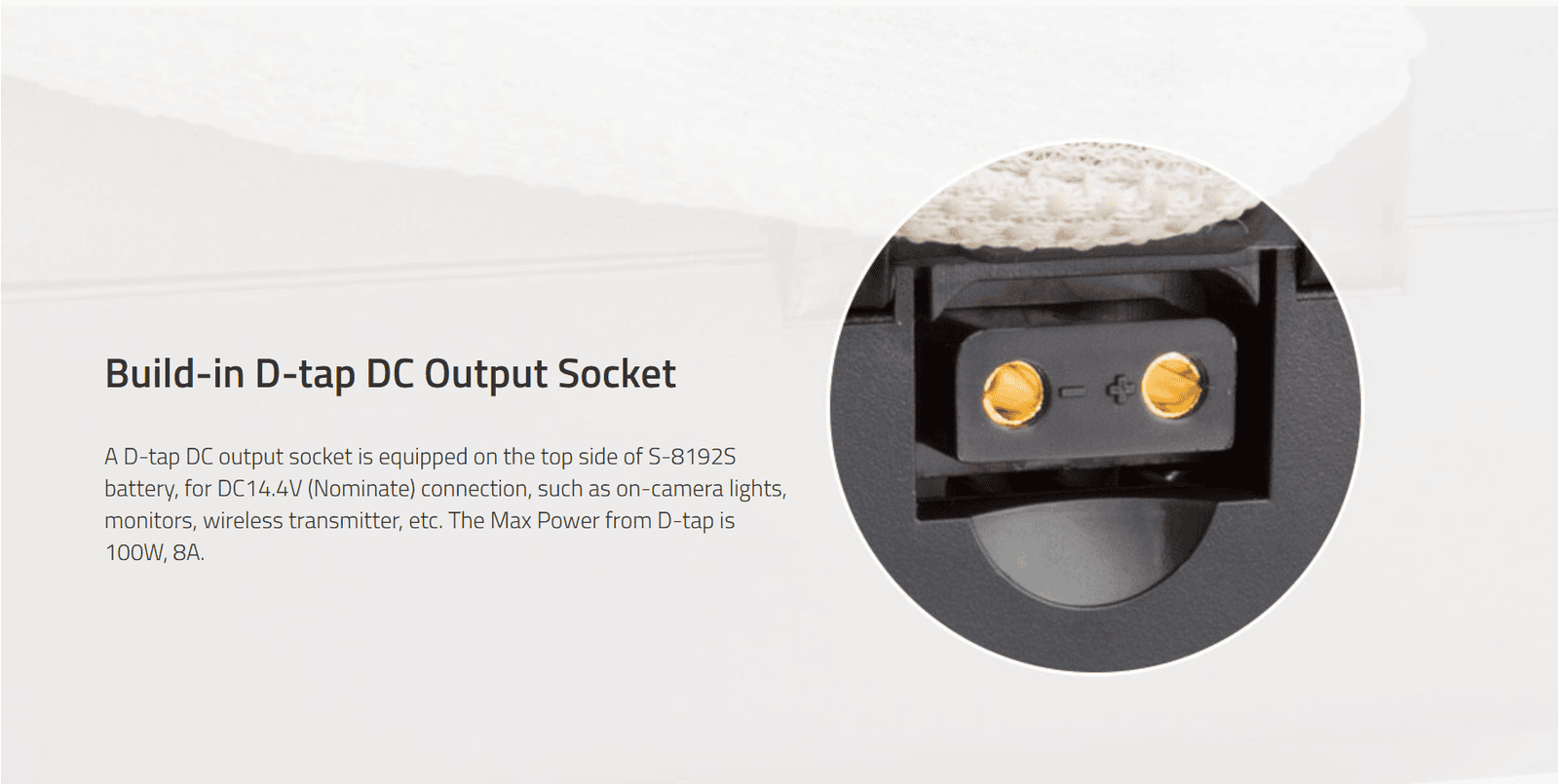 World's 1st patent of IATA-complied Battery; SWIT Exclusive Quality; Total 184Wh with separable design, high capacity but NO LIMIT for air transportation. max stable output 100W/8A; 3A fast charging; 14.4V; 1xD-tap in/output; 4-LED indicators; Multiple peak-current protections