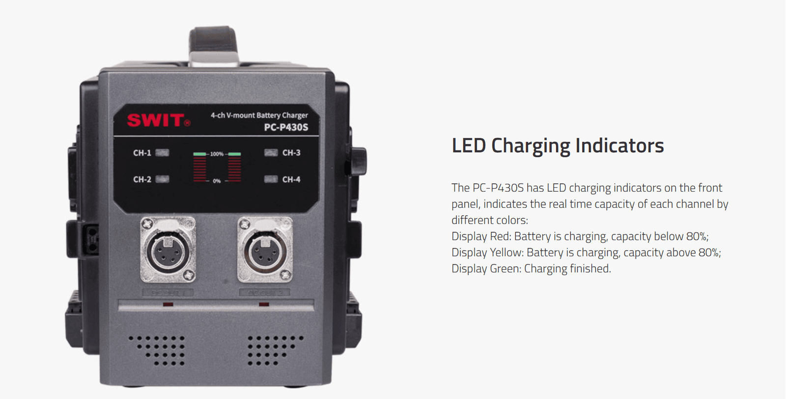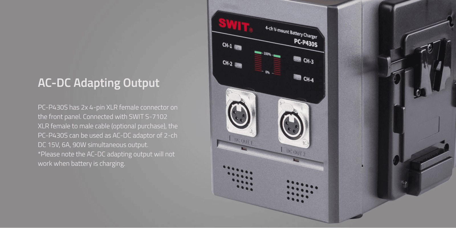 4ch x 3A Fast Simultaneous Charger & Adaptor: ◆SWIT Exclusive Quality ◆3A fast charging per channel ◆4-ch simultaneous fast charging; ◆2-ch 4-pin XLR simultanous 15V/6A DC output ◆LED charging indicators