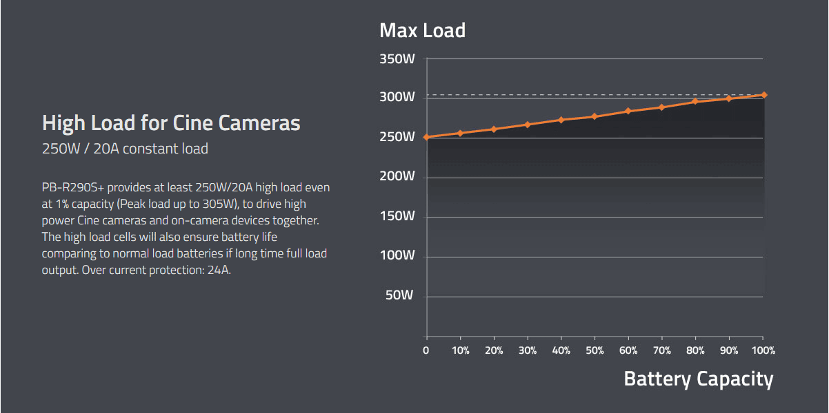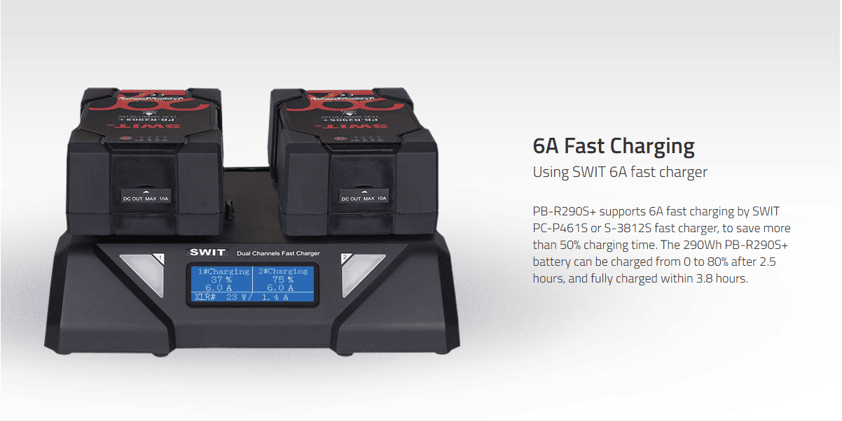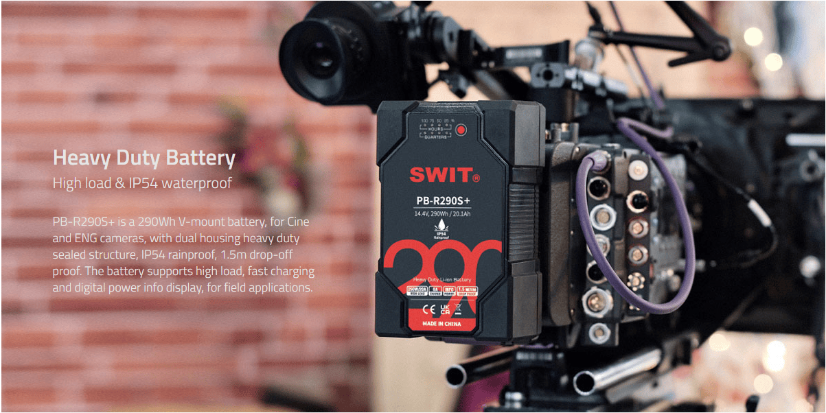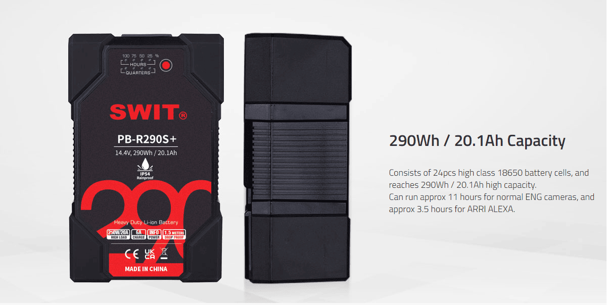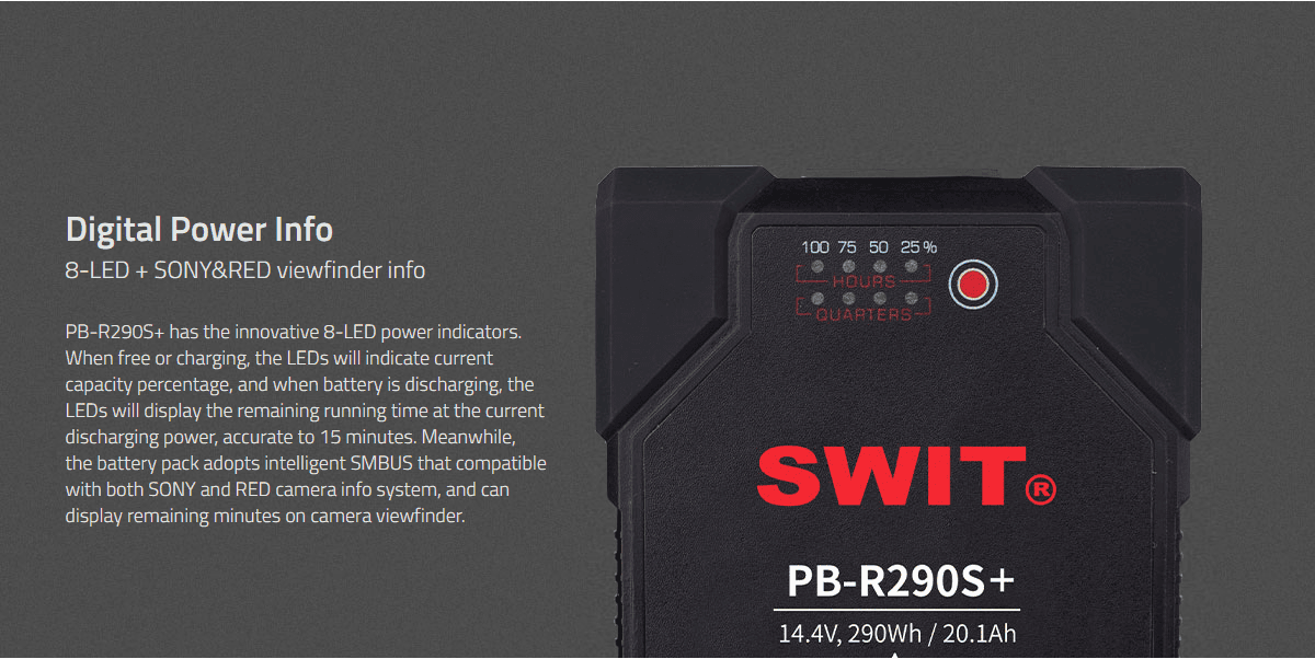 SWIT Exclusive Quality; Robust 290Wh; Water proof and dust proof IP54 certificated; Also especially ideal for long term use on high power draw lights with max stable output 250W/20A; 1.5m Drop-Off really tested, Protected with Robber Corners+Dual Housing; Multiple circuits and peak-current protections; 1xD-tap in/out; Power info on SONY/RED; 8-LED indicators; Only 3.5 hours with 6A fast charging (by SWIT PC-P460S/S-3812S); 14.4V V-mount