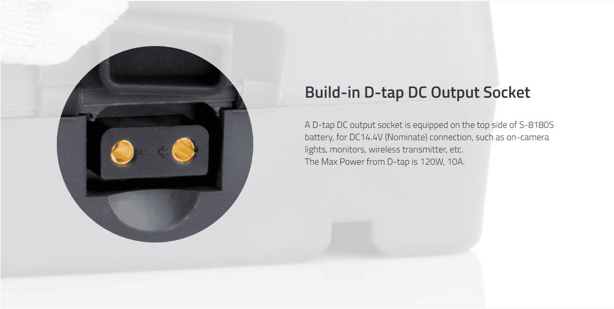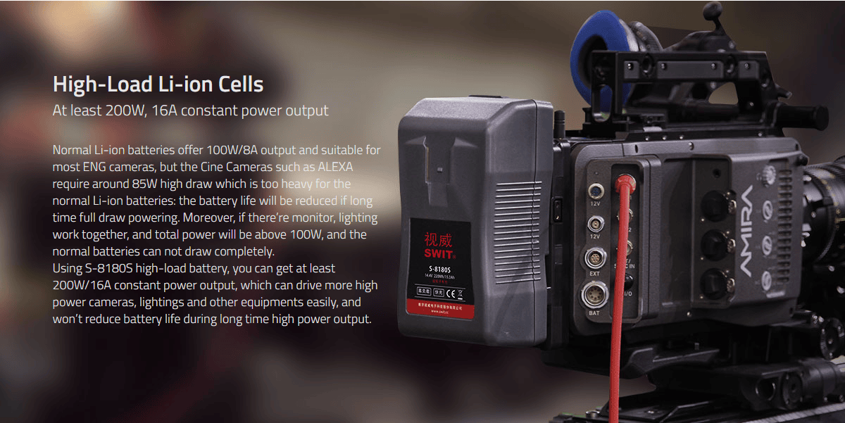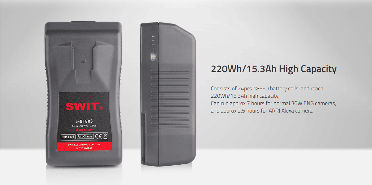 High Load; SWIT Exclusive Quality; Also especially ideal for long term use on high power draw lights with max stable output 200W/16A; 220Wh; 6A fast charging (by SWIT PC-P460S/S-3812S); 1xD-tap in/output; 4-LED indicators; Multiple peak-current protections; 14.4V V-mount