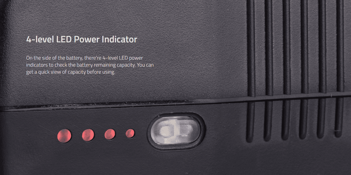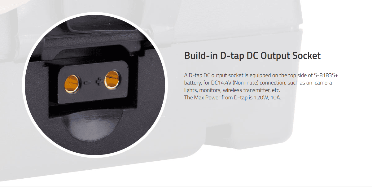 High Load; SWIT Exclusive Quality; Also especially ideal for long term use on high power draw lights with max stable output 250W/20A; 270Wh; 6A fast charging (by SWIT PC-P460S/S-3812S); 1xD-tap in/output; 4-LED indicators; Multiple peak-current protections; 14.4V V-mount