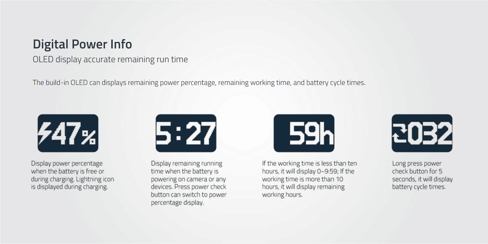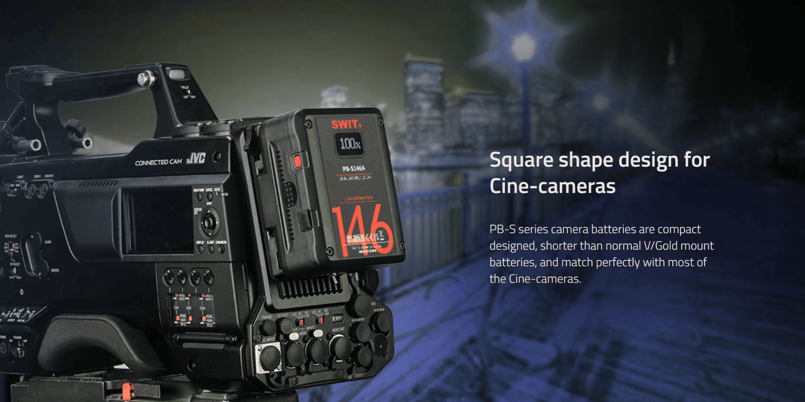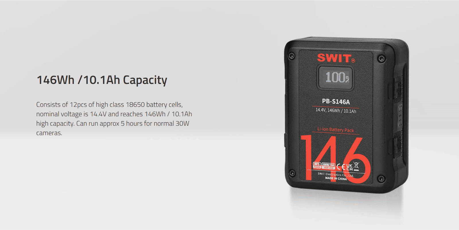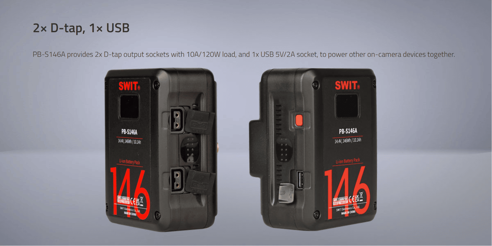 Especially fit slim Cine Cameras; Also especially ideal for long term use on high power draw lights with max stable output 200W/16A; SWIT Exclusive Quality; 146Wh; 2xD-tap in/out + 1xUSB 2A output; LCD display infos and alarm; Power info on SONY/RED; Multiple peak-current protections; 6A fast charging (by SWIT PC-P460A/S-3812A); 14.4V Gold-mount